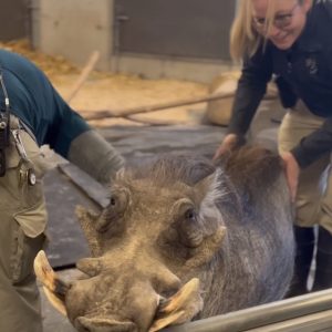 6-year-old warthog Swifty’s hoof care routine changes with the seasons. Swifty naturally wears down his hooves in warmer months while running through African Savanna. In colder months, when he prefers long naps over long runs, he requires more frequent trims.