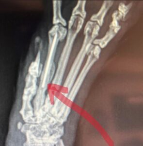 Our vet staff soon discovered a fracture in Ryder’s paw after collecting radiographs (x-rays) and performing an exam in which Ryder was temporarily sedated, called an anesthetized exam. When medically evaluating wild animals like Ryder, we always take the necessary precautions to keep ourselves and the animals safe—he’s not your average house cat, despite his looks!
