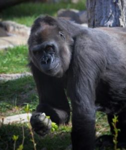 While the gorilla is the largest of the apes, the western lowland gorilla is the smallest of the three gorilla subspecies. Females are only half the weight of the males. Coat is black, brown or gray, with the adult male having a “silver back” saddle reaching to the thighs. This saddle is less defined than in the eastern lowland gorilla. Gorillas have powerful canines, especially in the males and the bulk of their body weight is carried on the legs.