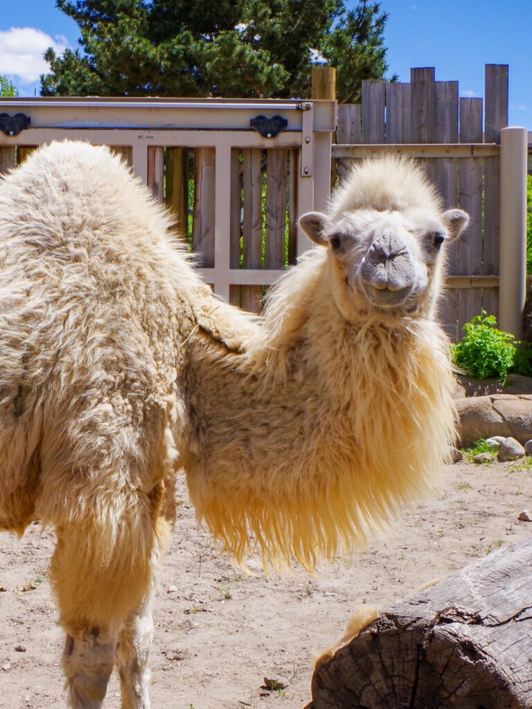 Bactrian camels have two humps compared to the Dromedary camel that only has one. They are also much larger than Dromedary camels and have heavy coats that they shed during the summer.