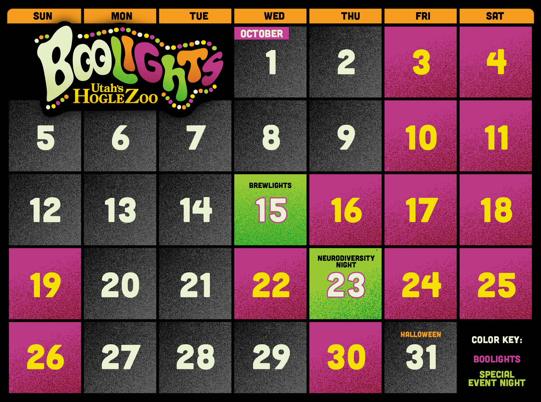 BooLights is an after-hours light display; most habitats will be closed or dark so the animals can get a full night’s rest, including: Great Apes, Bear den, the Small Animal Building, Creekside, Asian Highlands, South Hill, and the Ape Lobby. The Norma Education building will close at sundown.